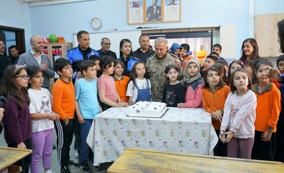 Iğdır İl Emniyet Müdürü Niyazi Turgay (sağda), doğum günü için kendisine mektup yazan, Hüsnü Özyeğin İlkokulu 3. sınıf öğrencisi Betül Çatamak'ın sınıfına gelip doğum gününü kutladı.