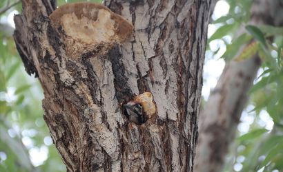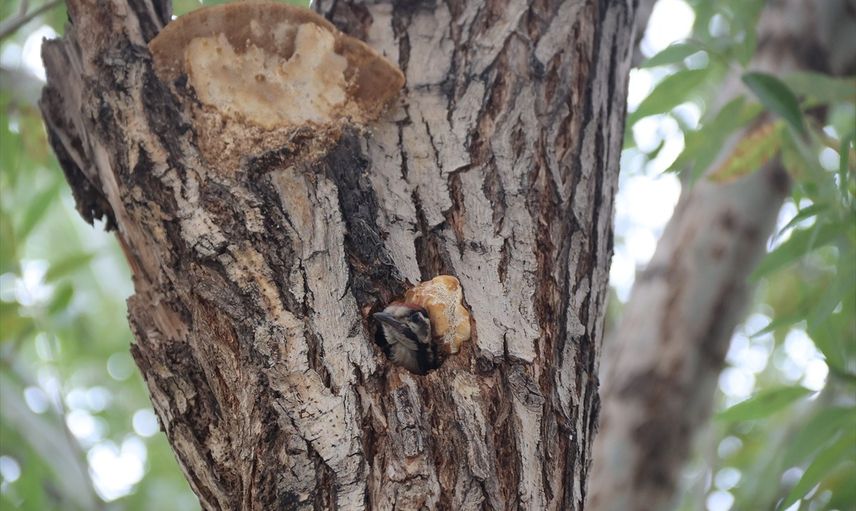 Iğdır İl Özel İdaresi bahçesindeki bir ağacın kovuğuna yuva yapan alaca ağaçkakan yavrusu, kurum çalışanlarının ilgi odağı haline geldi.