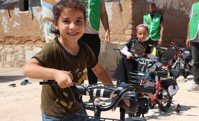 Suriye'nin çatışmalara maruz kalan İdlib ve Afrin bölgelerinde yaşayan 1300 yetim çocuğa bisiklet hibe eden İHH, bu girişimi ile çocukların yaşamlarına bir nebze olsun neşe katmayı hedefliyor.