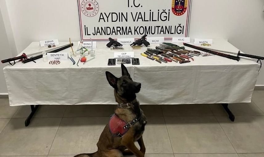 Arama sonucunda ele geçirilenler arasında 51 adet sentetik hap, 2 adet bong aparatı, 2 adet tabanca, 59 fişek, 3 şarjör, 25 adet sustalı bıçak, 2 adet samuray kılıcı, 1 muşta ve 5 cep telefonu bulundu.