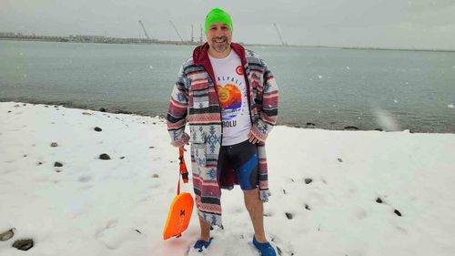 İnebolu'da 54 yaşındaki Saim Gürel, hava 1°C, deniz suyu 6–8°C iken kar altında denize girerek kışın da yüzdüklerini ve soğuk suyun şifa olduğuna inandıklarını söyledi.
