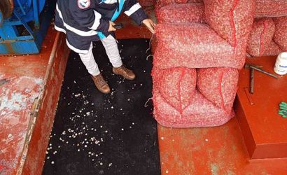 KARADENİZ’DE YAKALANAN BİN 400 TON BEYAZ KUM MİDYESİ, FABRİKALARDA İŞLENDİKTEN SONRA İTALYA’YA İHRAÇ EDİLİYOR.