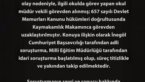 İnegöl'de okul müdürü savcıya ifade verdiBayrak töreninde yaşanan olay sonrası hem adli hem idari soruşturma başlatıldıBursa'nın İnegöl ilçesi kırsal Yeniceköy Mahallesi'nde bulunan Ömer Osman Çağlayan Ortaokulu'nda meydana gelen olayda, 6'ncı sınıf öğrencisi Muhammed Emin K.'nin yakasından tutulup yere savrulduğu iddia…