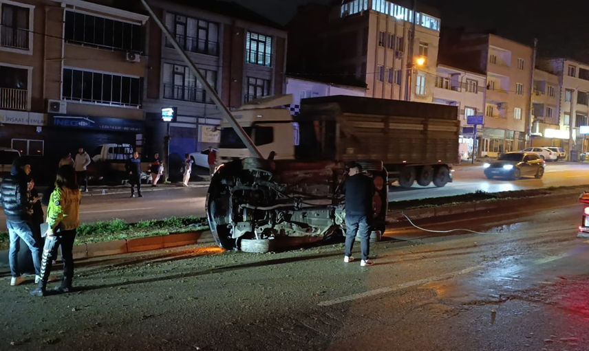 İnegöl’de yağışta kayan otomobil takla atıp aydınlatma direğine çarptı