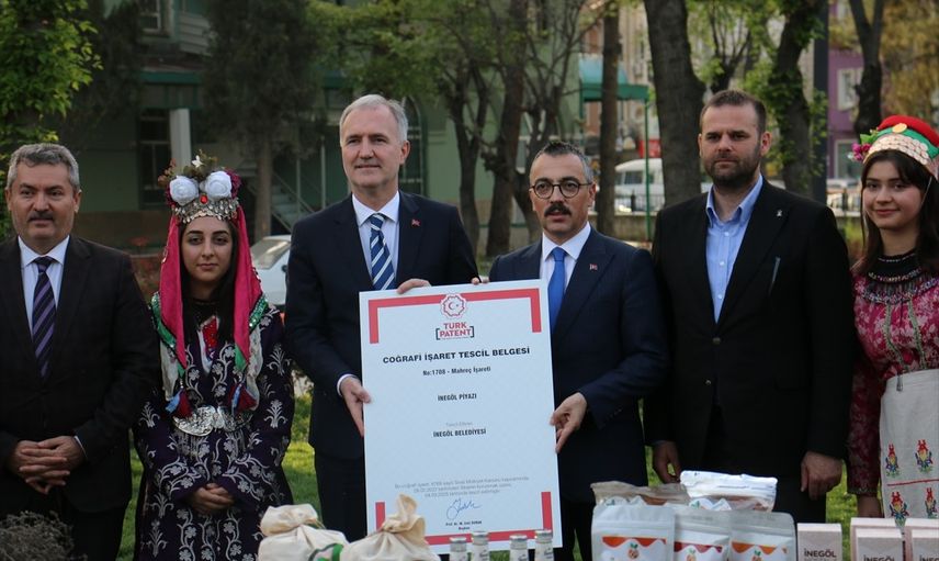 Bursa'nın köklü lezzetlerinden "İnegöl piyazı" coğrafi işaretle tescillendi. İnegöl Belediyesinin girişimleriyle tescillenen İnegöl piyazı düzenlenen programla kamuoyuna tanıtıldı. Düzenlenen tanıtım programında İnegöl Belediye Başkanı Alper Taban (sol 3) ve İnegöl Kaymakamı Eren Arslan (sağ 3) coğrafi işaret tescil belgesini kamuoyu ile paylaştı.