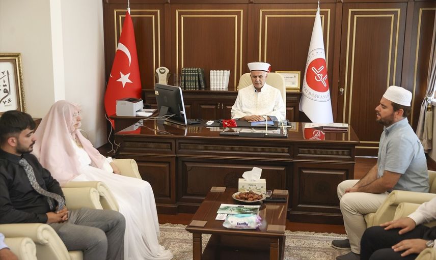 İngiliz Emily Anna (sol2) Gaziantepli nişanlısı Ferhat Tutan (solda) sayesinde Gaziantep İl Müftülüğünde düzenlenen ihtida töreniyle Müslüman olarak Emine adını aldı.