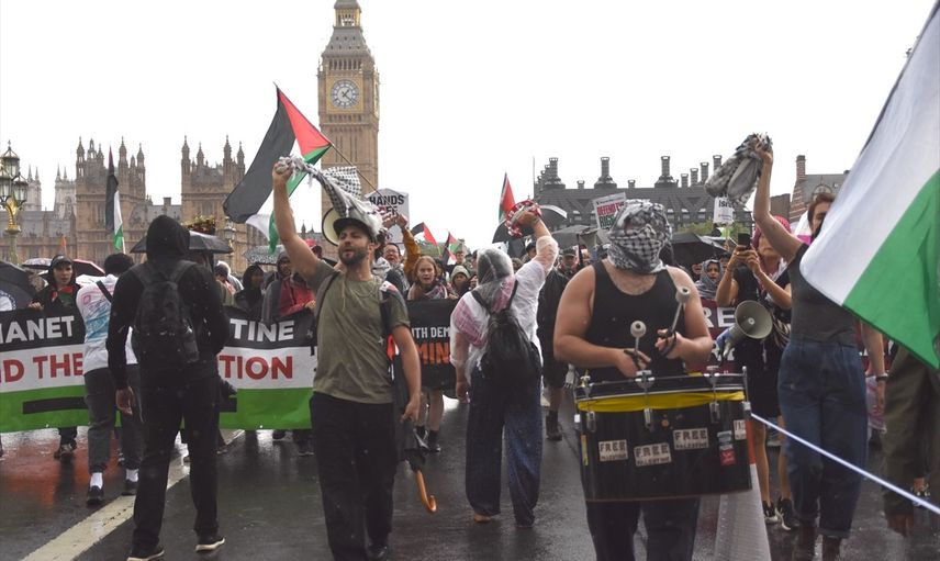 Göstericiler, Westminster Köprüsü üzerinden Thames Nehri'nin kuzeyinden güneyine yürüyerek, "Özgür Filistin", "Nehirden denize Filistin özgür olacak" ve "(İngiltere Başbakanı) Keir Starmer saklanamazsın seni soykırımla yargılayacağız" şeklinde sloganlar attı.