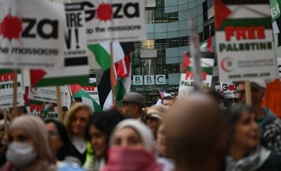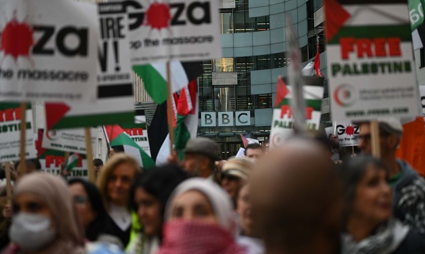 İngiltere'nin başkenti Londra'da, Filistin destekçisi göstericiler, BBC'nin Gazze ile ilgili haberlerinde İsrail'in savaş suçlarını gizlediği gerekçesiyle protesto düzenledi. Protesto, BBC'nin Portland Place'teki merkez binası önünde gerçekleştirildi.