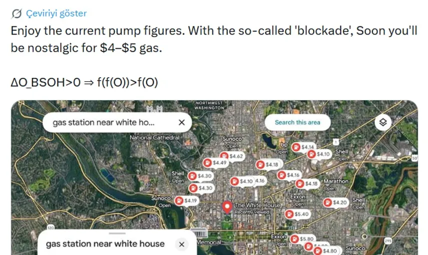 Ayrıca Galibaf, farklı benzin istasyonlarındaki fiyatları gösteren bir uygulamada yaptığı "Beyaz Saray’a yakın benzin istasyonu" aramasının ekran görüntüsünü paylaşarak mesajını somutlaştırdı.