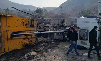 Hatay'ın İskenderun ilçesi Aşkarbeyli Mahallesi sınırlarında meydana gelen kazada, yük boşaltımı yapan bir hafriyat kamyonu devrildi.