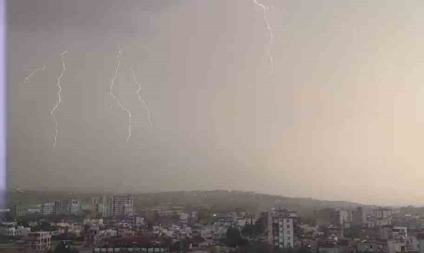 Meteoroloji'nin şiddetli yağış uyarısı yaptığı Doğu Akdeniz'de akşam saatlerinde etkili olan yağış sırasında gökyüzünü bir anda aydınlatan yıldırım, büyük bir gürültüyle düştü.