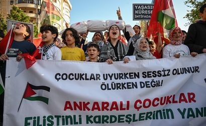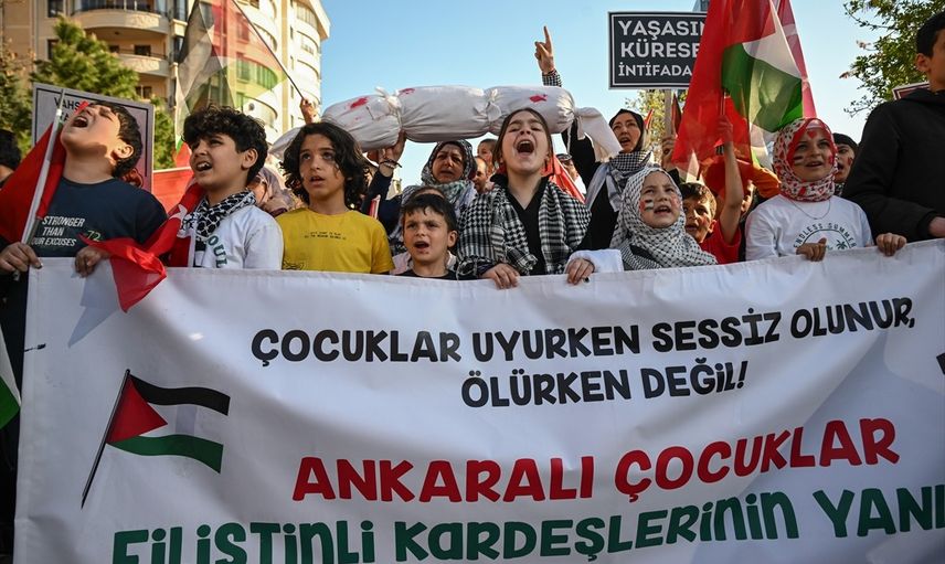 Protestoya katılanlar, "Küresel çeteye karşı küresel direniş", "Gazze'de insanlar, dünyada insanlık ölüyor", "Yaşasın küresel intifada", "Nehirden denize özgür Filistin" yazılı dövizler taşıdılar. Ayrıca, Gazze'deki çocuk katliamlarına dikkat çekmek için çocukların öncülüğünde bir kortej oluşturuldu ve Büyükelçilik önüne çocuk ayakkabıları ve kefenler bırakıldı.