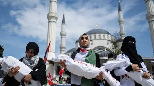 İstanbul'da düzenlenen yürüyüşle İsrail'in Gazze'ye yönelik saldırıları protesto edildi, katılımcılar Gazze'deki ölümleri temsilen bebek cenazeleri taşıdı.