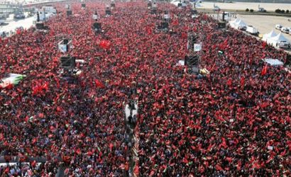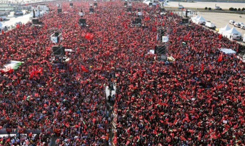 İsrail’in Filistin’e yönelik saldırılarına karşı tepki göstermek için miting alanını hınça hınç doldurdu. Erdoğan, alana giriş yaptığı sırada kurulan platformda mitinge katılanları selamladı. Mitinge katılanlar, İsrail’in saldırılarını lanetledi ve Filistin halkına destek mesajları verdi. Alanda Filistin bayrakları dalgalanırken, “Filistin’e özgürlük”, “İsrail katildir” gibi sloganlar atıldı.