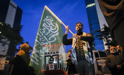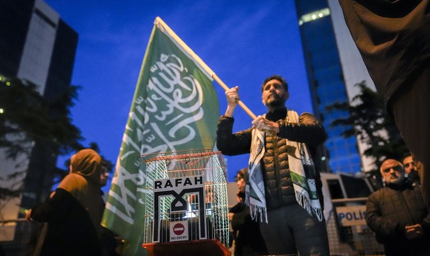 Protesto öncesinde Kur'an-ı Kerim tilaveti yapıldı ve katılımcılar, ellerindeki pankartlarla İsrail aleyhine sloganlar atarak tepkilerini dile getirdi.