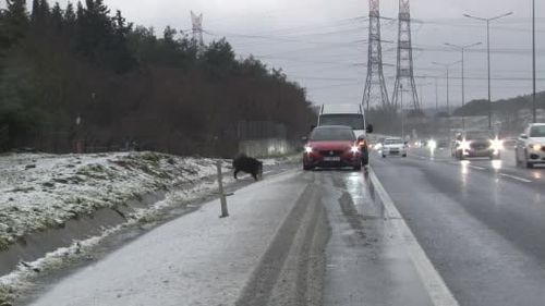 Soğuk hava ve aralıklarla kar nedeniyle yiyecek arayan yaban domuzu, Hasdal-Kemerburgaz yoluna indi; kısa süre yol kenarında beslendikten sonra ormanlık alana döndü.
