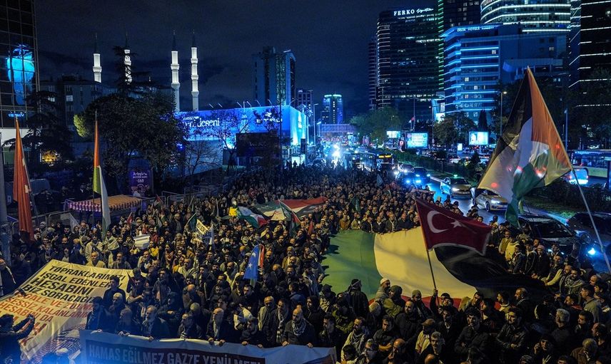 Toplananlar ellerinde Türk ve Filistin bayraklarıyla, "Özgür Filistin", "Bu son gece, şimdi değil de ne zaman?" ve "Hamas eğilmez Gazze yenilmez" yazılı pankartlar taşıdı. Eylemciler "Katil İsrail hesap verecek", "Filistin halkı yalnız değildir" ve "İstanbul'dan Hamas'a, direnişe bin selam" sloganlarını attı. Katılımcılardan birinin üzerinde "Özgürlük Filosu onurumuzdur" yazılı gemi maketiyle alanda olduğu gözlendi.