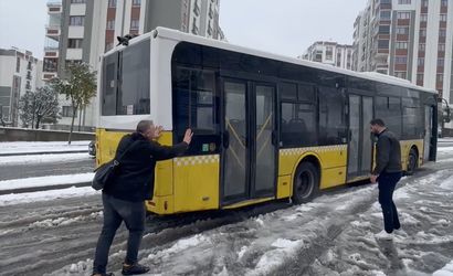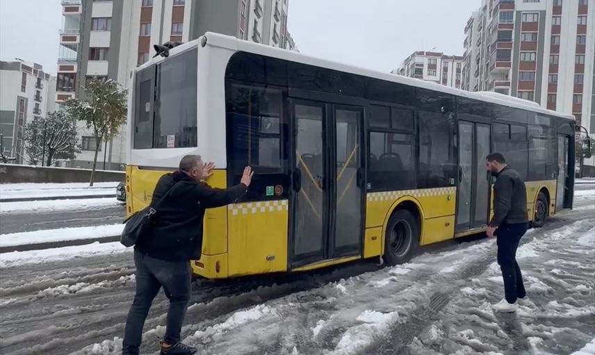 İstanbul'da bazı bölgelerde yer yer şiddetini artıran kar yağışı nedeniyle sürücüler zor anlar yaşarken, bir İETT otobüsü yolda kaldı. Çevredeki vatandaşlar yardıma koşarak, karı temizleyip yolda kalan otobüsü kurtardı.