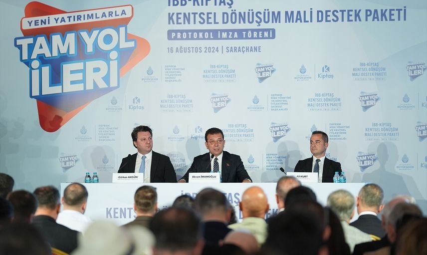 İstanbul Büyükşehir Belediyesi (İBB) ile iştirak şirketi KİPTAŞ arasında, riskli yapılarını yenilemek isteyen düşük gelirli hak sahipleri için kentsel dönüşüm mali destek paketi protokolü imzalandı. İBB Başkanı Ekrem İmamoğlu (ortada), Saraçhane'deki İBB Başkanlık binasında gerçekleşen imza törenine katılarak konuşma yaptı.