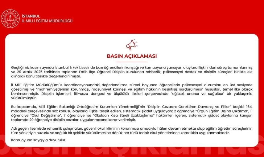 İSTANBUL İL MİLLİ EĞİTİM MÜDÜRLÜĞÜ, 25 KASIM 2025 TARİHİNDE İSTANBUL ERKEK LİSESİ ERKEK PANSİYONUNDA ÖĞRENCİLER ARASINDA ÇIKAN KAVGA İDDİALARI ÜZERİNE BAŞLATILAN İDARİ SORUŞTURMANIN TAMAMLANDIĞINI AÇIKLADI. AÇIKLAMADA OLAYLARA KARIŞAN 20 ÖĞRENCİYE DİSİPLİN CEZASI VERİLDİĞİ BELİRTİLDİ.