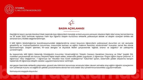 İstanbul Erkek Lisesi pansiyonundaki kavga sonrası 20 öğrenciye disiplin cezası İstanbul İl Milli Eğitim Müdürlüğü, 25 Kasım 2025 tarihinde İstanbul Erkek Lisesi erkek pansiyonunda ortaya çıkan kavga iddialarıyla ilgili başlatılan idari soruşturmanın tamamlandığını açıkladı. Açıklamada, olaylarla ilişkili olduğu tespit edilen…