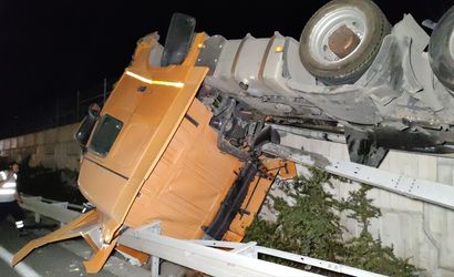 Bursa'nın Orhangazi ilçesinde devrilerek refüjde ters dönen tırın sürücüsü yaralandı.