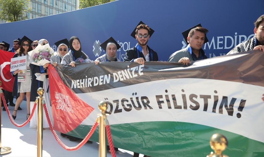 İstanbul Medipol Üniversitesinde mezuniyet heyecanı yaşayan öğrenciler, tören sırasında hazırladıkları pankartlarla Filistin ve Gazze'ye destek mesajı verdi. "Nehirden denize, özgür Filistin", "İşgalci İsrail 230 gazeteciyi katletti", "Gazze'de ölüm çocuk oyunu" ve "Yaşasın insanlık yaşasın çocuklar" gibi ifadelerin yer aldığı pankartlar, tören alanındaki katılımcılar tarafından destek gördü, bazı pankartlarda ise barış ve dayanışma çağrısında bulunuldu.