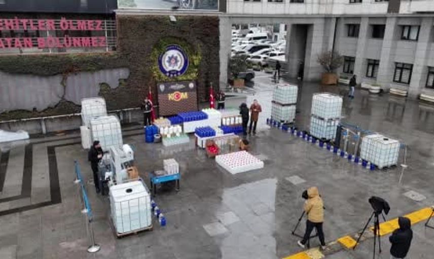 İstanbul, Tekirdağ ve Antalya’da ele geçirilen tonlarca sahte alkol emniyette sergilendi
