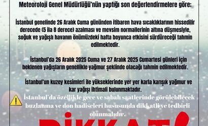 "Meteoroloji Genel Müdürlüğü’nün yaptığı son değerlendirmelere göre, İstanbul genelinde 26 Aralık Cuma gününden itibaren hava sıcaklıklarının 5 ila 8 derece azalması ve mevsim normallerinin altına düşmesiyle, soğuk ve yağışlı havanın önümüzdeki hafta boyunca etkisini sürdüreceği tahmin edilmektedir. İstanbul’da 26 Aralık 2025 Cuma ve 27 Aralık 2025 Cumartesi günleri için beklenen yağışların genellikle yağmur şeklinde olacağı tahmin edilmektedir. İstanbul’un kuzey kesimleri ile yükseklerinde yer yer karla karışık yağmur ve kar yağışı ihtimali bulunmaktadır. İstanbul’da özellikle gece ve sabah saatlerinde görülebilecek buzlanma ve don hadiseleri hususunda dikkatli ve tedbirli olunmalıdır."