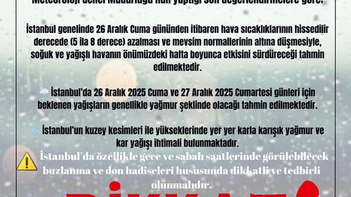 İstanbul Valiliği'nden hafta sonu hava uyarısı İstanbul Valiliği, hafta sonu il genelindeki hava durumuna ilişkin yazılı bir açıklama yayımladı. 26 Aralık 2025 Cuma ve 27 Aralık 2025 Cumartesi günleri için kentin kuzey kesimleri ile yükseklerinde yer yer karla karışık yağmur…