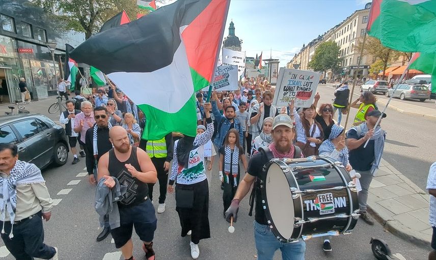 İsveç'te İsrail'in Stockholm Büyükelçiliği önünde toplanan Filistin destekçileri, Gazze'ye yönelik saldırılara tepki gösterdi. Göstericiler, İsrail'in aylardır süren Gazze'ye yönelik saldırılarının son bulmasını talep etti.