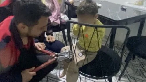 Osmaniye'de itfaiye şoförü Yunus Emre Arslan'ın oğlunun ayağı sandalyenin demir kısmına sıkıştı; mesai arkadaşları demir kesme makasıyla müdahale ederek çocuğu sağ salim kurtardı.