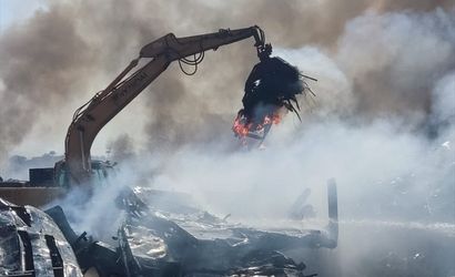 İzmir'in Aliağa ilçesinde hurda depolama alanında çıkan yangına müdahale ediliyor.