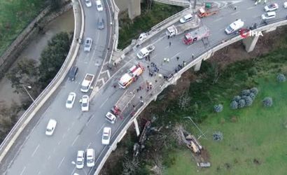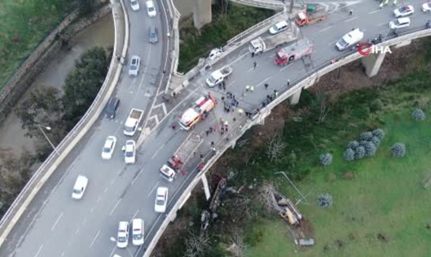 Çarpmanın etkisiyle savrulan otomobil yol kenarındaki bariyerleri kırarak köprüde asılı kaldı. Kamyonun kasasında yüklü bulunan iş makinesi ise köprüden aşağı düştü.