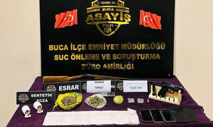 İZMİR'İN BUCA İLÇESİNDE UYUŞTURUCU MADDE TİCARETİ VE İMALATINA YÖNELİK DÜZENLENEN OPERASYONDA 5 ŞÜPHELİ GÖZALTINA ALINDI. ŞÜPHELİLERİN ADRESLERİNDE YAPILAN ARAMALARDA UYUŞTURUCU MADDE, HASSAS TERAZİ, RUHSATSIZ SİLAH VE UYUŞTURUCU TİCARETİNDEN ELDE EDİLDİĞİ DEĞERLENDİRİLEN 47 BİN LİRA NAKİT PARA ELE GEÇİRİLDİ.