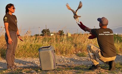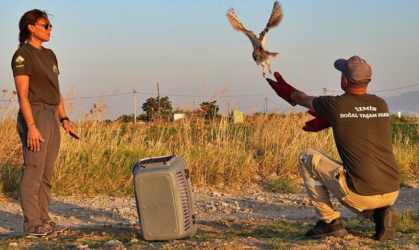 İzmir'de, 40 gün önce annesiz kalınca İzmir Doğal Yaşam Parkı'na getirilerek özenle bakılan 6 peçeli baykuş, doğaya bırakıldı.