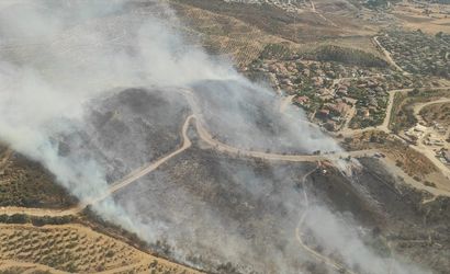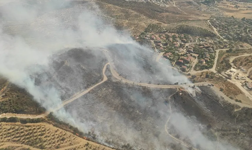 İzmir'in Urla ilçesindeki Bademler Mahallesi'nde makilik alanda çıkan yangına havadan ve karadan müdahale ediliyor.