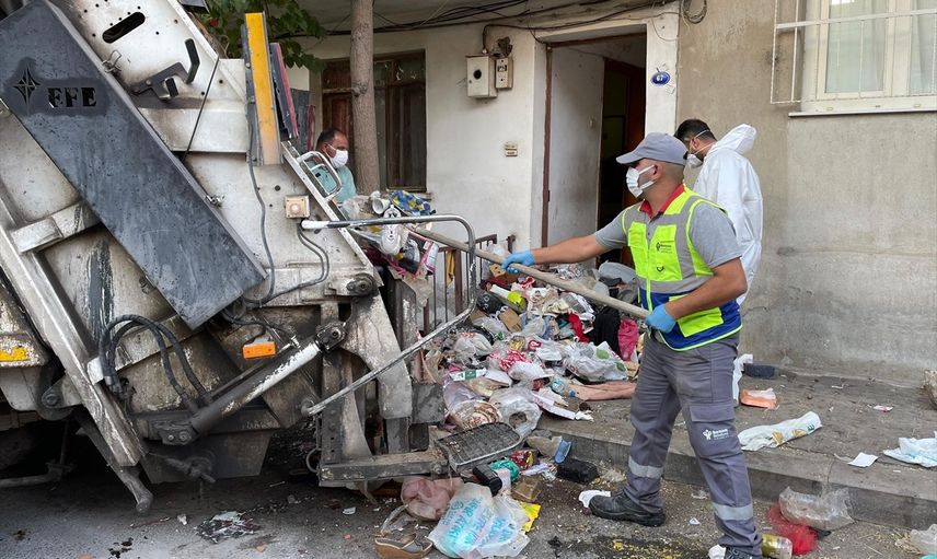 Bornova Belediyesi'ne bağlı Temizlik İşleri, Fen İşleri ve Park ve Bahçeler Müdürlüğü ekipleri, zabıta ve polis eşliğinde evde temizlik çalışmaları gerçekleştirdi. Temizlik sırasında, evin içindeki çöp yığınları kamyonla tahliye edildi.