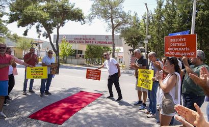 İzmir'de kooperatif mağdurları Buca Cezaevi önünde 'kırmızı halı' eylemi