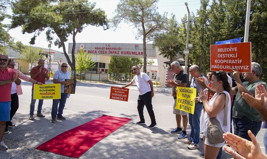 İzmir Büyükşehir Belediyesinin başlattığı konut projeleri ilerlemediği için evlerine kavuşamayan hak sahipleri, CHP Genel Başkanı Özgür Özel'in 25 Ağustos'taki açıklamalarına tepki amacıyla cezaevi önünde kırmızı halı serdi. Kooperatif soruşturması kapsamında tutuklu bulunan CHP İzmir İl Başkanı Şenol Aslanoğlu ile eski İzmir Büyükşehir Belediye bulunduğu Buca Ceza İnfaz Kurumu önünde toplanan grup, "Belediyeye güvendik, mağdur olduk", "Mağdurlar burada, hırsızlar nerede?" yazılı pankartlar taşıdı.
