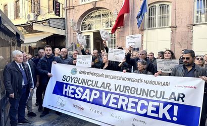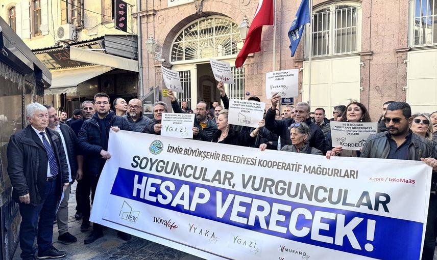 İzmir Büyükşehir Belediyesinin kendilerini mağdur ettiğini ileri süren 6 ayrı yapı kooperatifinin üyeleri, belediye önünde eylem yaptı. Büyükşehir Belediyesinin Egemenlik Binası önünde toplanan bir grup, üzerinde "Soyguncular, vurguncular hesap verecek" yazılı pankart açtı, daha sonra slogan attı.