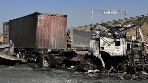 İzmir Bornova'daki Ankara Asfaltı Caddesi'nde bir tırın, minibüs ve otomobile çarpması sonucunda yangın çıktı!