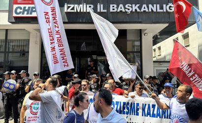 İzmir Büyükşehir Belediyesi ile Tüm Belediye ve Yerel Yönetim Hizmetleri Emekçileri Sendikası (Tüm Bel-Sen) ile gerçekleştirilen toplu sözleşme görüşmelerinde uzlaşma sağlanamaması üzerine bir gün iş bırakan memurlar, CHP İl Başkanlığı önünde eylem yaptı.