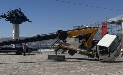 İzmir'de, Cumhuriyet Halk Partisi (CHP) tarafından 19 Mayıs'ta gerçekleştirilecek olan miting için Gündoğdu Meydanı'nda sahne kurulum çalışmaları sırasında bir kaza meydana geldi. Plakası öğrenilemeyen bir vinç, sürücüsünün direksiyon hakimiyetini kaybetmesi sonucu yan yattı. Olayda vinçte bulunan bir kişi yaralandı.