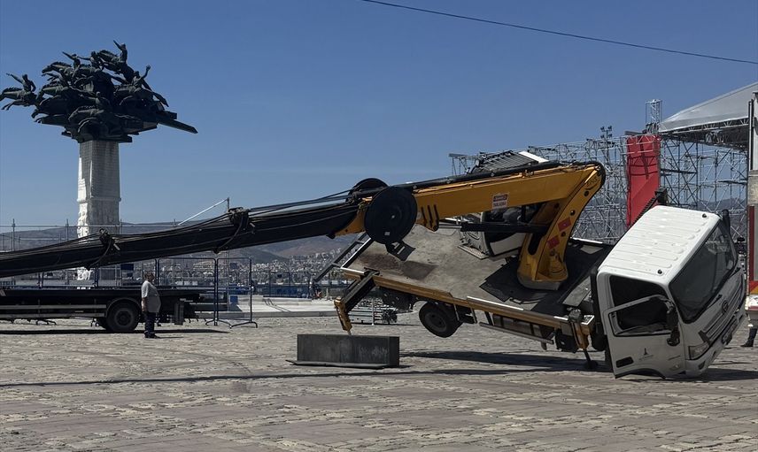 İzmir'de CHP'nin 19 Mayıs'ta yapacağı miting için kurulan sahne çalışmaları sırasında yan yatan vinçteki 1 kişi yaralandı.
