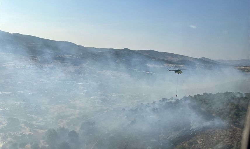 İzmir'in Dikili ilçesinde makilik ve çamlık alanda çıkan yangına karadan ve havadan müdahale ediliyor.