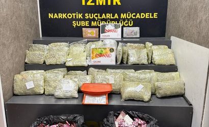 İzmir'in Konak ilçesinde düzenlenen uyuşturucu operasyonunda 28 kilo 240 gram esrar ve skunk, 2 kilo 166 gram kokain ile 29 bin 350 sentetik ecza ele geçirildi, 2 şüpheli gözaltına alındı.