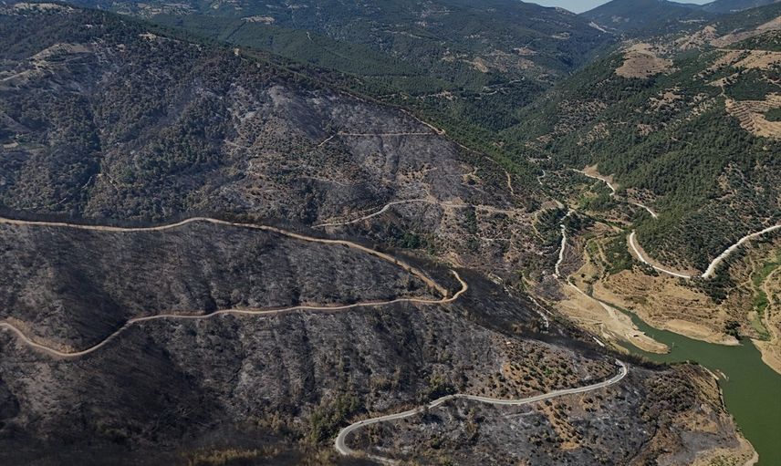 İzmir'in Ödemiş ilçesinde, rüzgarın etkisiyle geniş alana yayılan ancak ekiplerin yoğun müdahalesiyle kontrol altına alınan orman yangınında zarar gören alanlar, evler ve ağıllar havadan görüntülendi. Sarp arazide, yoğun çam ormanlarının yanı sıra zeytin bahçelerinin de bulunduğu bölge, yangın sonrası yeşil alanlar siyaha büründü.