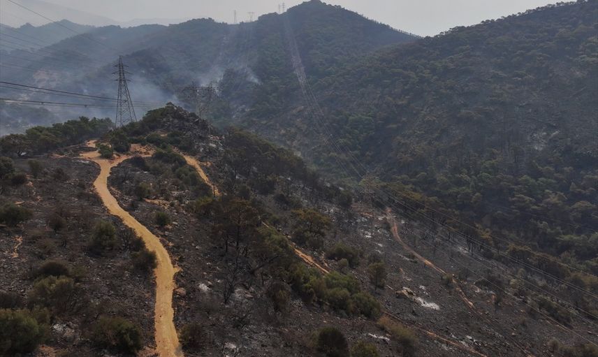 İzmir'in Karşıyaka ilçesi Yamanlar Karatepe mevkisinde çıkan orman yangınında zarar gören alanlar, havadan görüntülendi.