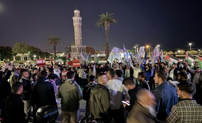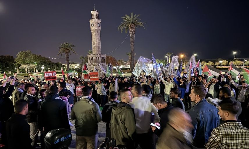 Konak Meydanı'nda toplanan grup İsrail aleyhine slogan attı. Ellerinde Türk ve Filistin bayrakları ile çeşitli pankartlar taşıyan vatandaşlar tekbir getirdi.